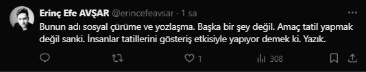 “Bunun adı sosyal çürüme ve yozlaşma. Başka bir şey değil. Amaç tatil yapmak değil sanki. İnsanlar tatillerini gösteriş etkisiyle yapıyor demek ki. Yazık.”