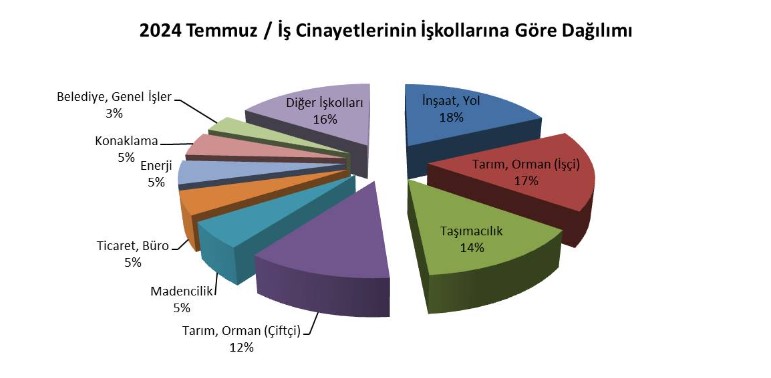 TEMMUZ AYINDA İŞ CİNAYETLERİNİN İŞKOLLARINA GÖRE DAĞILIMI İSE ŞÖYLE: