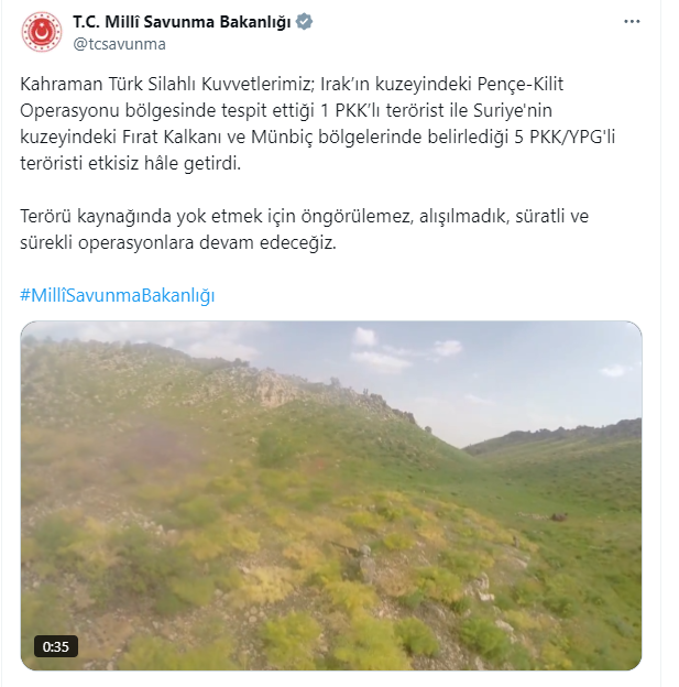 "Kahraman Türk Silahlı Kuvvetlerimiz; Irak’ın kuzeyindeki Pençe-Kilit Operasyonu bölgesinde tespit ettiği 1 PKK’lı terörist ile Suriye'nin kuzeyindeki Fırat Kalkanı ve Münbiç bölgelerinde belirlediği 5 PKK/YPG'li teröristi etkisiz hâle getirdi. Terörü kaynağında yok etmek için öngörülemez, alışılmadık, süratli ve sürekli operasyonlara devam edeceğiz."