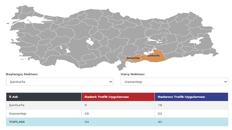 Şanlıurfa’dan Gaziantep’e gitmeyi planlayan sürücüler için güzergah üzerindeki radar bilgileri dikkat çekici. Şanlıurfa il sınırlarında 9 radarlı ve 18 radarsız trafik uygulaması bulunurken, Şanlıurfa-Gaziantep arasında toplamda 34 radarlı ve 40 radarsız olmak üzere 74 denetim noktası yer alıyor.