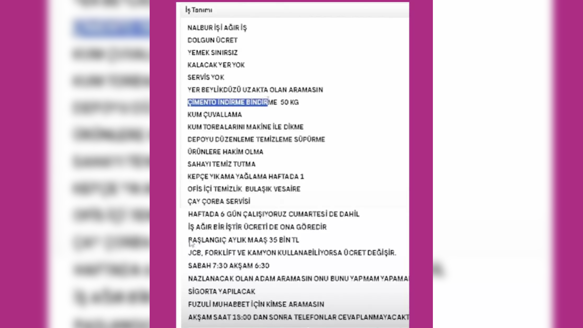 Beylikdüzü’nde bir iş yeri sahibinin verdiği iş ilanı sosyal medyada büyük yankı uyandırdı. İşveren, alacağı elemandan çimento taşıma, depo düzenleme, kum çuvallama ve bunları dikme, temizlik yapma, bulaşık yıkama, çay ve çorba servisi ile kepçe yıkama ve yağlama gibi ağır işlerin yapılmasını bekliyor.