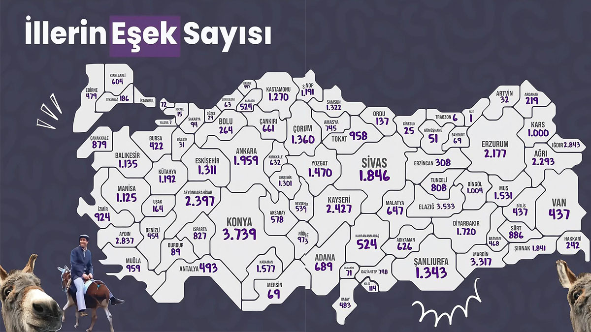 Karadeniz illeri ise listenin son sıralarında yer aldı. Rize’de yalnızca 1 eşek tespit edilirken, Trabzon’da bu sayı 6 olarak kayıtlara geçti.