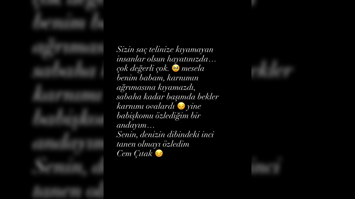 Çıtak, “Sizin saç telinize kıyamayan insanlar olsun hayatınızda… Mesela benim babam karnım ağrıdığında sabaha kadar başımda beklerdi. Yine babişkomu özledim bir andayım… Senin, denizin dibindeki inci tanen olmayı özledim” sözleriyle duygularını ifade etti.
