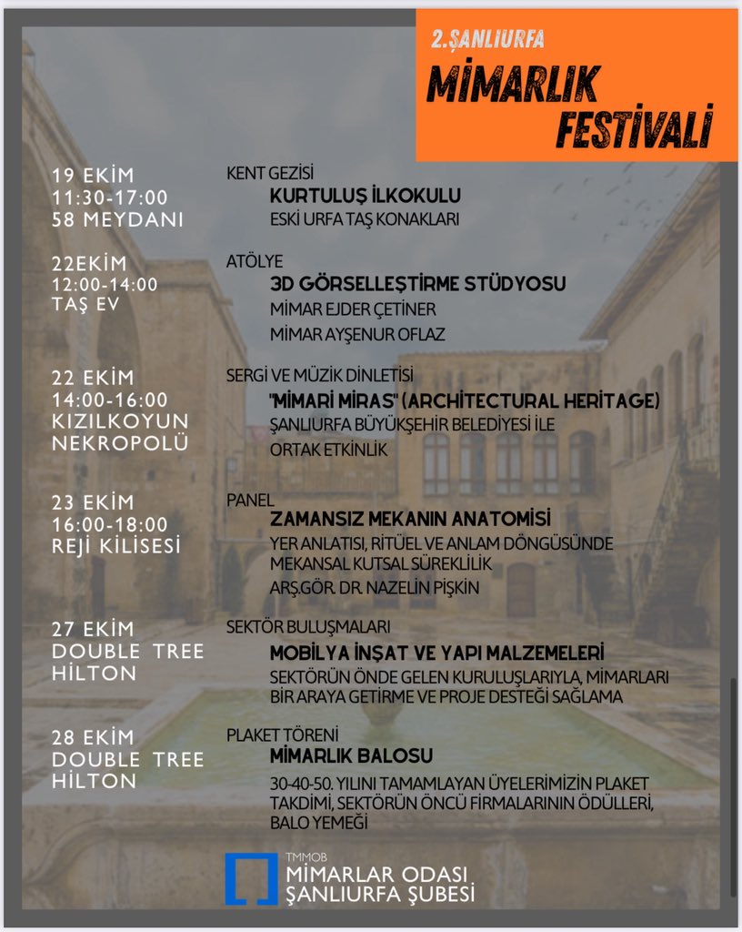 11–28 Ekim’de arasında gerçekleşen festivalde paneller, sergiler, kent gezileri, atölyeler, sektör buluşmaları gerçekleştiriliyor. Bu kapsamda dün üyeler tarafında kent gezisi gerçekleştirildi. Kurtuluş İlkokulu ile eski Urfa ta konakları gezildi. Geziye dair yapılan açıklamada “Kentimizin kültürel ve mimari mirasını yerinde görmek, geçmişle bugün arasında güçlü bir bağ kurmamıza vesile oldu” denildi.