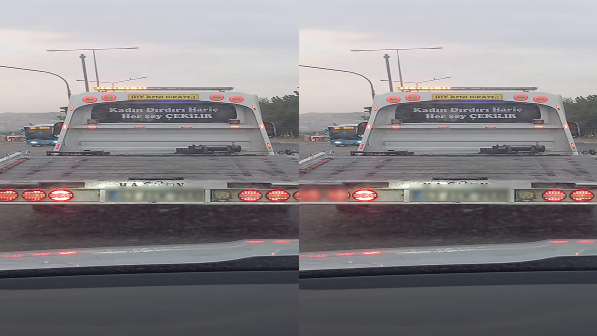 Bir vatandaş, trafikte ilerleyen çekiciyi fark edip arkasındaki yazıyı cep telefonuyla kaydetti. Çekicinin arka camına yazılmış olan metin, "Kadın dırdırı hariç her şey çekilir" şeklindeydi.