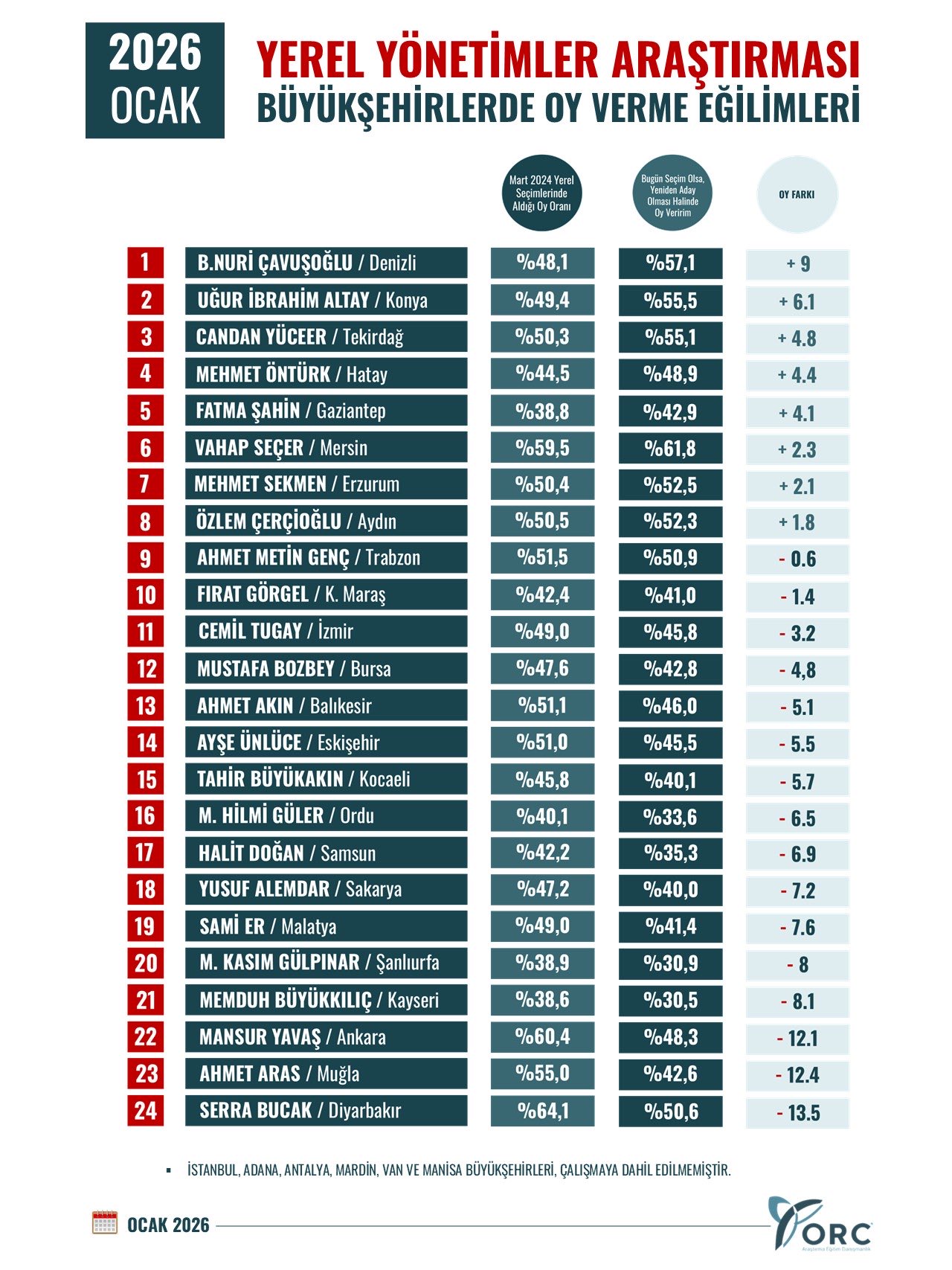 ORC Araştırma Şirketi’nin Ocak 2026 döneminde gerçekleştirdiği “Yerel Yönetimler Araştırması – Büyükşehirlerde Oy Verme Eğilimleri” çalışması kamuoyuyla paylaşıldı.