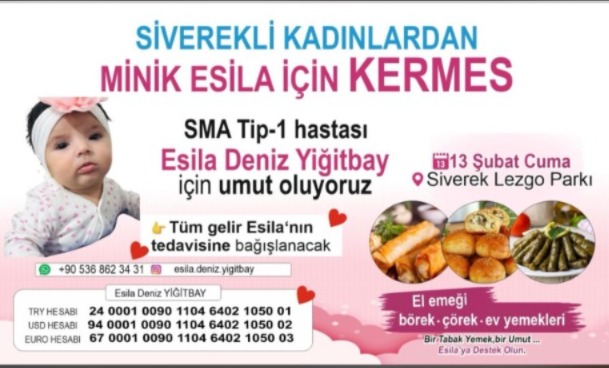 Siverek'te kadınlar, SMA hastası minik Esila Deniz Yiğitbay'ın tedavisine destek olmak için seferber oldu. Minik Esila’nın tedavi masraflarına katkı sağlamak amacıyla Siverekli kadınlar tarafından kermes düzenleneceği öğrenildi. 13 Şubat Cuma günü Siverek Lezgo Parkı’nda gerçekleştirilecek kermeste, kadınların el emeğiyle hazırladığı börek, çörek ve çeşitli ev yemekleri satışa sunulacak. Kermesten elde edilecek gelirin tamamı ise Esila’nın tedavisi için bağışlanacak.