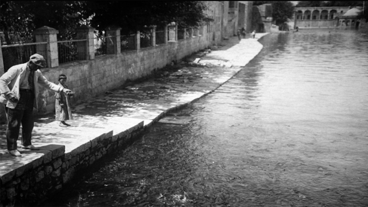 Fotoğrafta, Oppenheim'ın 1911 yılındaki Urfa ziyareti sırasında Balıklıgöl kenarında balıklara yem attığı görülüyor. Karede, gölün o yıllardaki dokusu ve çevredeki yapılar dikkat çekiyor.