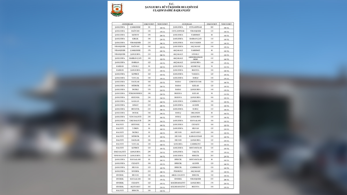 Şanlıurfa Büyükşehir Belediyesi Ulaşım Koordinasyon Merkezi (UKOME) tarafından ilçe minibüs ücretlerine güncelleme kararı alındı.